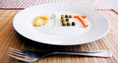 Słowo dieta w plasterkach warzywa w płycie na drewnianym stole, widok z góry
