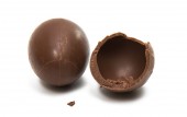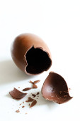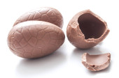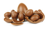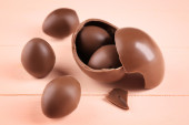 Czekoladowe jaja wielkanocne na drewnianym stole, zbliżenie