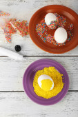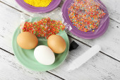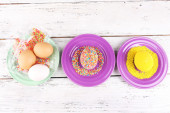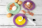 Kobieta dekorowania wielkanocnych jaj na drewnianym stole, zbliżenie