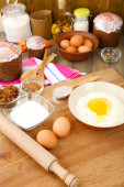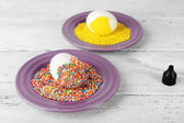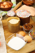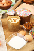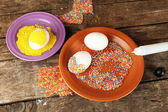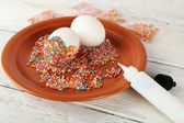 Dekorowania wielkanocnych jaj na tabliczce koloru na drewnianym stole, zbliżenie