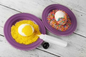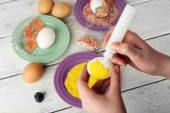 Zdjęcie "Dekorowania wielkanocnych jaj na tabliczce koloru na drewnianym stole, zbliżenie" może być wykorzystywane do celów osobistych i komercyjnych zgodnie z warunkami zakupionej licencji Royalty-free. Obraz jest dostępny do pobrania w jakości wysokiej rozdzielczości do 5760x3840.