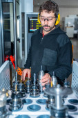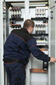 Widok tylny pracownika napraw elektrycznych układów mechanicznych w fabryce