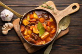 Zdjęcie "Gulasz z ziemniakami, w sosie pomidorowym, z przyprawami i ziołami, zbliżenie, bez ludzi, na czarnym tle" może być wykorzystywane do celów osobistych i komercyjnych zgodnie z warunkami zakupionej licencji Royalty-free. Obraz jest dostępny do pobrania w jakości wysokiej rozdzielczości do 5760x3840.