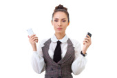 Zdjęcie "Wizytówka - pewnie interesu przytrzymanie puste pusty znak. Wszystko na białym tle." może być wykorzystywane do celów osobistych i komercyjnych zgodnie z warunkami zakupionej licencji Royalty-free. Obraz jest dostępny do pobrania w jakości wysokiej rozdzielczości do 5760x3840.