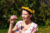 młoda dziewczyna dmuchanie baniek mydlanych w lato zielony park