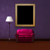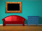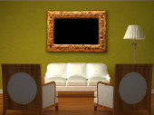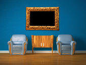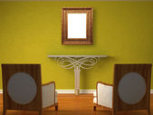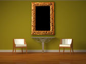 dwa luksusowe fotele naprzeciwko zielony ściana z metalowych konsoli i nowoczesne ramki