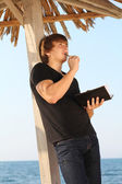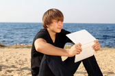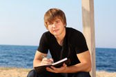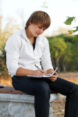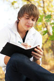 młody człowiek spokojny, czytanie książki w przyrodzie, jesień