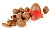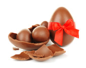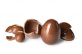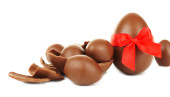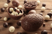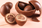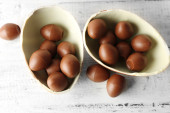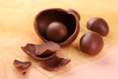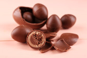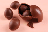 Czekoladowe jaja wielkanocne na drewnianym stole, zbliżenie