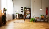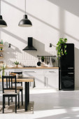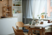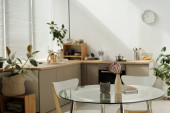 Część przestronnej kuchni z blatem, grupa krzeseł, drewniany stół z przyborami kuchennymi i zielonymi roślinami domowymi rosnącymi w doniczkach