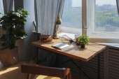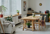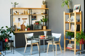 Zdjęcie "Część przestronnej kuchni z blatem, grupa krzeseł, drewniany stół z przyborami kuchennymi i zielonymi roślinami domowymi rosnącymi w doniczkach" może być wykorzystywane do celów osobistych i komercyjnych zgodnie z warunkami zakupionej licencji Royalty-free. Obraz jest dostępny do pobrania w jakości wysokiej rozdzielczości do 5760x3840.