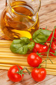 makaron, oliwa z oliwek i pomidorów na tle drewna