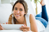 Piękna młoda kobieta pracuje nad laptopem w domu.