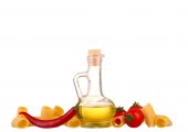 makaron, pomidory, bazylia i czosnek. na białym tle