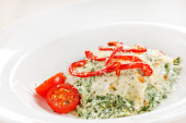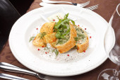 ciasto rybne z sosem i chipsami ziemniaczanymi
