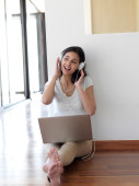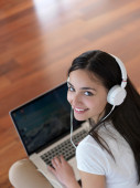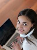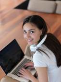 Kobieta w domu pracy na komputerze przenośnym