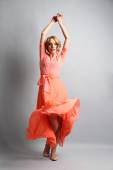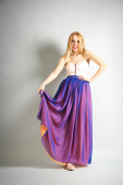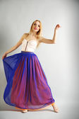 Piękna młoda kobieta w sukni koloru pozowanie na jasnym tle
