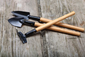 Rozsady pomidorów w białe filiżanka, łopatę i prowizji na tle drewniane