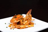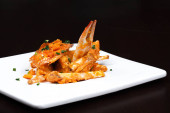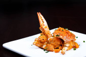 Duże czerwone krewetki z małży, chorizo, kuskus, dziki czosnek