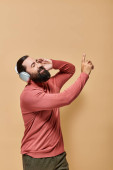 Zdjęcie "Stylowy mężczyzna w wielowarstwowym stroju ze słuchawkami bezprzewodowymi tańczący do muzyki na różowym tle" może być wykorzystywane do celów osobistych i komercyjnych zgodnie z warunkami zakupionej licencji Royalty-free. Obraz jest dostępny do pobrania w jakości wysokiej rozdzielczości do 5760x3840.