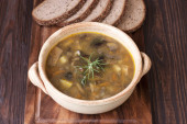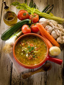 Zdrowa wegetariańska zupa fasolowa w misce na starym drewnianym stole