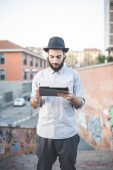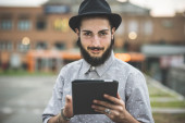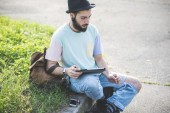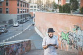 Hipster gejów współczesnego człowieka za pomocą tabletu