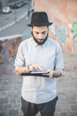 Zdjęcie "Hipster gejów współczesnego człowieka za pomocą tabletu" może być wykorzystywane do celów osobistych i komercyjnych zgodnie z warunkami zakupionej licencji Royalty-free. Obraz jest dostępny do pobrania w jakości wysokiej rozdzielczości do 5760x3840.