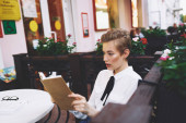 Zdjęcie "Stylowa kobieta siedzi przy stole z pięknym uśmiechem, w domu nowoczesne wnętrze, zachód słońca światło, styl życia w komforcie. Wysokiej jakości zdjęcie" może być wykorzystywane do celów osobistych i komercyjnych zgodnie z warunkami zakupionej licencji Royalty-free. Obraz jest dostępny do pobrania w jakości wysokiej rozdzielczości do 5760x3840.