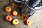 Sokowirówka i szklanka wypełniona sokiem jabłkowym na stole kuchennym. Robię sok w domu. Przestrzeń kopiowania.