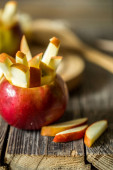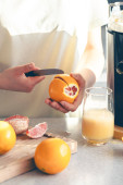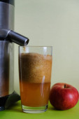 Zdjęcie "Sokowirówka i szklanka wypełniona sokiem jabłkowym na stole kuchennym. Robię sok w domu. Przestrzeń kopiowania." może być wykorzystywane do celów osobistych i komercyjnych zgodnie z warunkami zakupionej licencji Royalty-free. Obraz jest dostępny do pobrania w jakości wysokiej rozdzielczości do 5760x3840.
