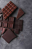 Kupa pysznych kawałków ciemnej czekolady lub kostek, posiekany, połamany batonik czekoladowy na ciemnym tle.