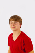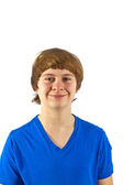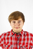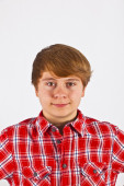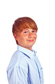 inteligentny mały chłopiec uśmiecha się na białym tle