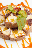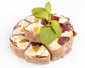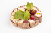 Tiramisu roll sushi, przyozdobionym z winogron i miętą