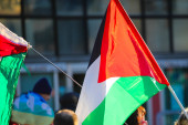 Palestyńska flaga machająca podczas demonstracji protestacyjnej z wieloma ludźmi na ulicach miasta