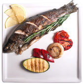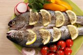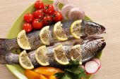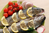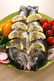 przygotowany pstrąg z cytryny i sałatka na talerzu