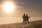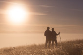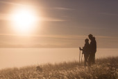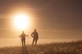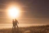 Sylwetka para aktywnych w miłości z słup Trekking w porannej mgle