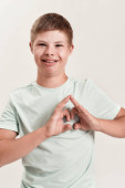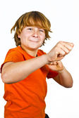 portret ładny chłopiec z gestykulacji shirt pomarańczowy z rękami