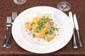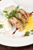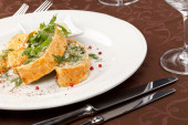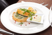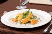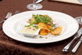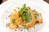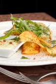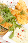 ciasto rybne z sosem i chipsami ziemniaczanymi