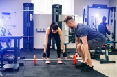 Mężczyzna i kobieta robiący pompki w siłowni. Mężczyzna i kobieta są umieszczeni na podłodze sali gimnastycznej, wykonując pompki z precyzją i siłą.