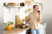 Zdjęcie "Kobieta stoi w kuchni, trzymając kubek w dłoni.." może być wykorzystywane do celów osobistych i komercyjnych zgodnie z warunkami zakupionej licencji Royalty-free. Obraz jest dostępny do pobrania w jakości wysokiej rozdzielczości do 5760x3840.