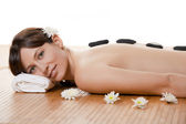 Spa salon: kobieta relaksujący na matę z kwiatów i kamienie