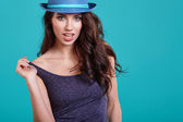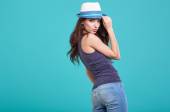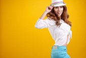 Kobieta wiosna kapelusz przeciwko żółty