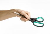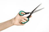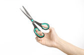 Biura i domu temat: ludzką ręką trzymając czarny nożyczki z niebieskimi akcentami na biały na białym tle w studio