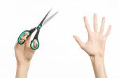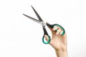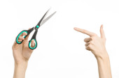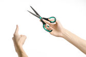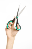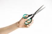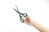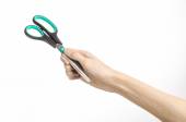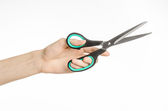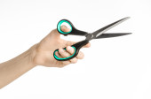 Biura i domu temat: ludzką ręką trzymając czarny nożyczki z niebieskimi akcentami na biały na białym tle w studio