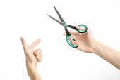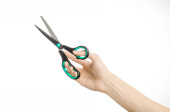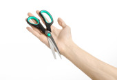 Biura i domu temat: ludzką ręką trzymając czarny nożyczki z niebieskimi akcentami na biały na białym tle w studio