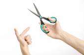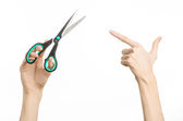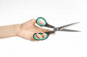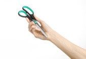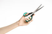 Biura i domu temat: ludzką ręką trzymając czarny nożyczki z niebieskimi akcentami na biały na białym tle w studio