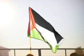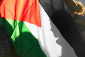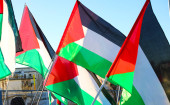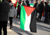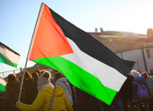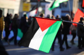 wiele palestyńskich flag powiewających podczas demonstracji antywojennej