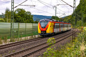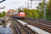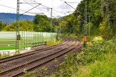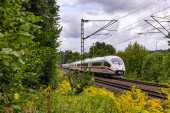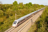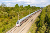 Zdjęcie "Międzymiastowy pociąg ekspresowy na torze kolejowym między przyrodą, drzewami i roślinami kwitnącymi na wsi" może być wykorzystywane do celów osobistych i komercyjnych zgodnie z warunkami zakupionej licencji Royalty-free. Obraz jest dostępny do pobrania w jakości wysokiej rozdzielczości do 5760x3840.