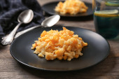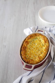 Domowej roboty pieczony makaron z serem na talerzu, widok z boku.