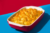Domowej roboty pieczony makaron z serem w potrawie do pieczenia, widok z góry. Płaskie ułożenie, nad głową, z góry.