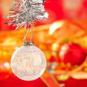 srebrny Christmas cacko i czerwoną wstążką na lodzie